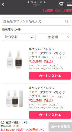 「新着順」または「商品名順」のボタンを押すことで、検索結果を並び替えることができます。