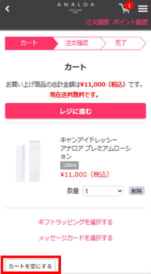 カート内の商品をすべて削除したい場合、「カートを空にする」ボタンを押してください。