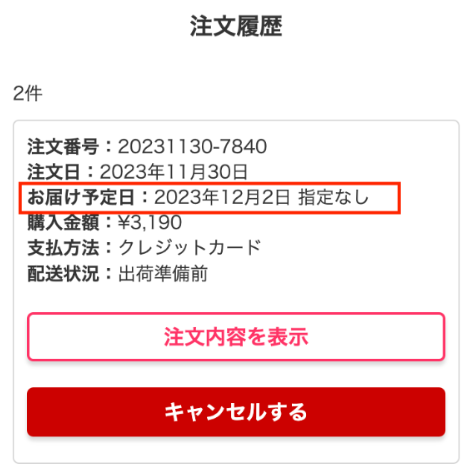 過去に注文した一覧が表示され、「お届け予定日」から確認できます。